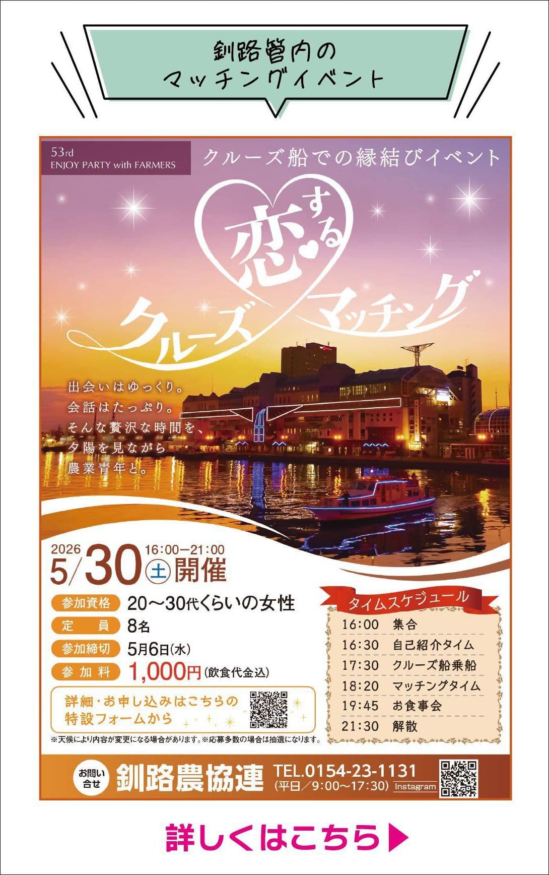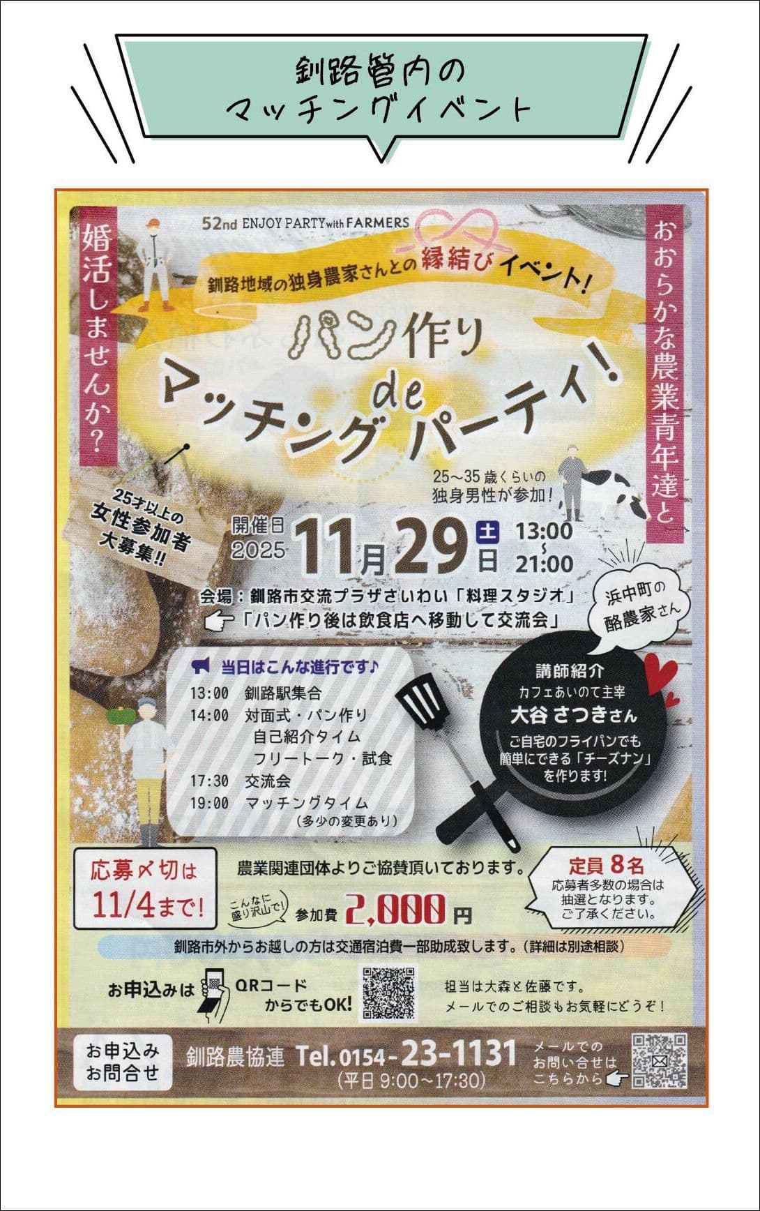 浜中町農業青年と出会いの予感!! たくさんのご応募いただきありがとうございました。 冬の婚活ツアーは、終了しました。 酪農家との婚活イベント 問い合わせ 浜中町農業後継者対策推進協議会へのお問い合わせフォームを設けています。浜中町の酪農後継者にご関心がある方、さまざまな婚活のプランご用意しております。 さらに詳しく