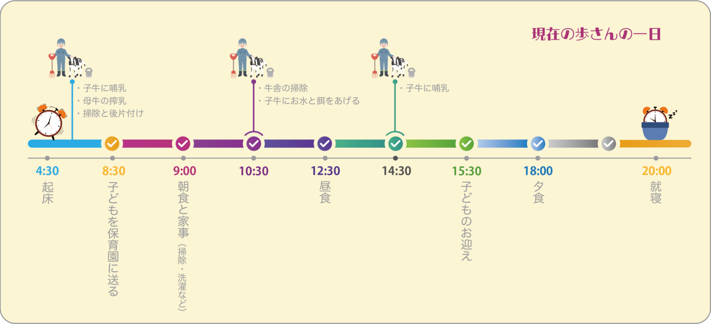 公務員のお父さんと専業主婦のお母さんに育てられ、酪農とは縁がなく、動物も苦手だったという歩さんですが、靖さんと知り合い、子牛と触れ合ううちに乳牛に慣れていったそうです。